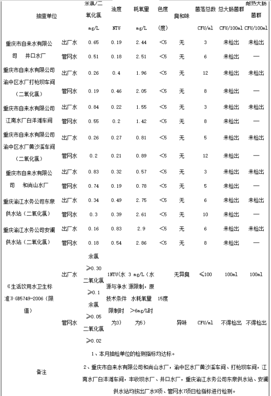 2017年1月,重慶市供水處對我市2家供水企業(yè)的7個(gè)水廠進(jìn)行了水質(zhì)監(jiān)測。結(jié)果表明,本月抽檢單位的檢測指標(biāo)均達(dá)標(biāo)。重慶市自來水有限公司和尚山水廠,渝中區(qū)水廠黃沙溪車間、打槍壩車間,江南水廠白洋灘車間,豐收壩水廠、井口水廠,重慶渝江水務(wù)公司東泉供水站、安瀾供水站均按出廠水9項(xiàng)、管網(wǎng)水7項(xiàng)日檢指標(biāo)進(jìn)行檢測。