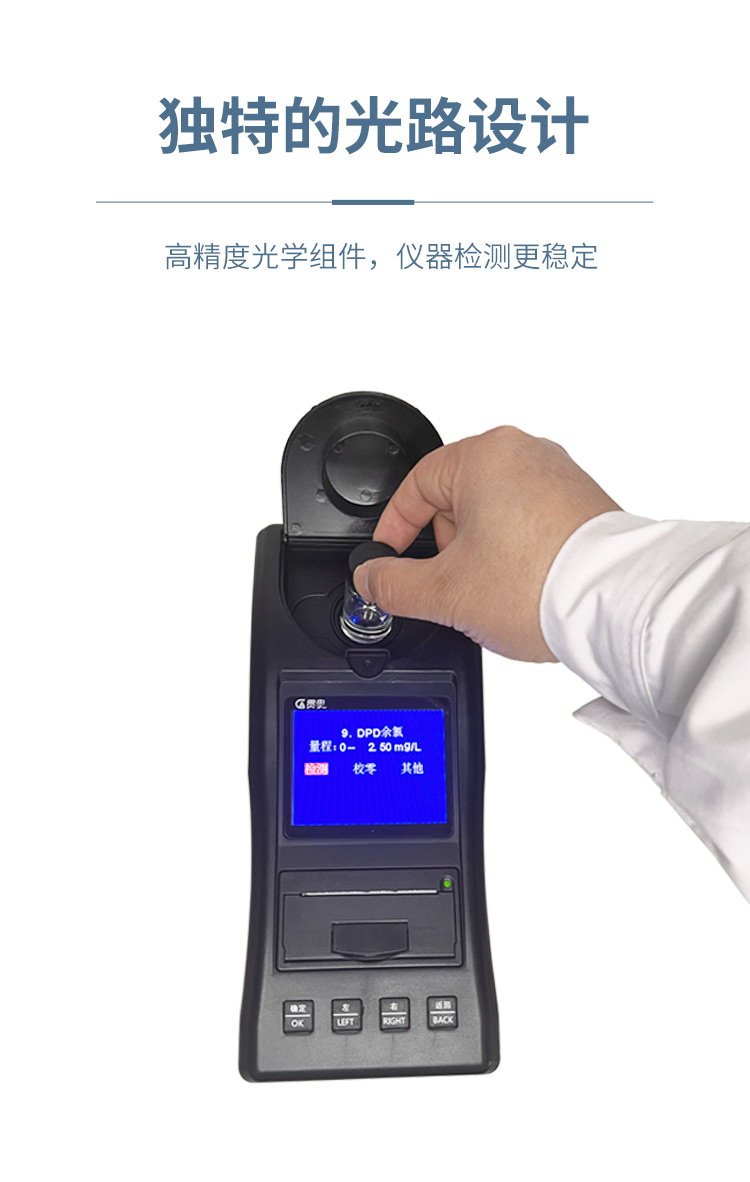 被檢測水質(zhì)樣品放入DPD游離余氯試劑時,水樣會變成紅色,將水樣放入儀器后,余氯水質(zhì)檢測儀會通過光電比色檢測原理比較紅色的深淺,從而得出被檢測水質(zhì)的余氯濃度大小。