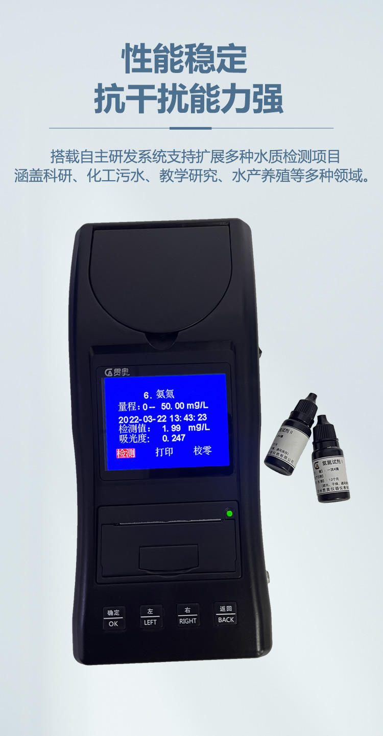 氮素類水質(zhì)專用檢測儀可用于測定水中不同形態(tài)的氮:硝酸鹽氮、亞硝酸鹽氮、氨氮等參數(shù)。本儀器接受定制,用戶可根據(jù)需求定制所需的參數(shù)。